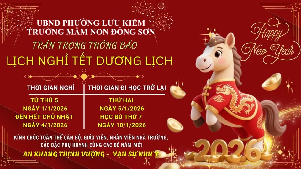 Trường Mầm non Đông Sơn trân trọng thông báo đến Quý phụ huynh cùng các con học sinh về lịch nghỉ Tết Dương lịch năm 2026 như sau: 💆 👦 Đối với học sinh: