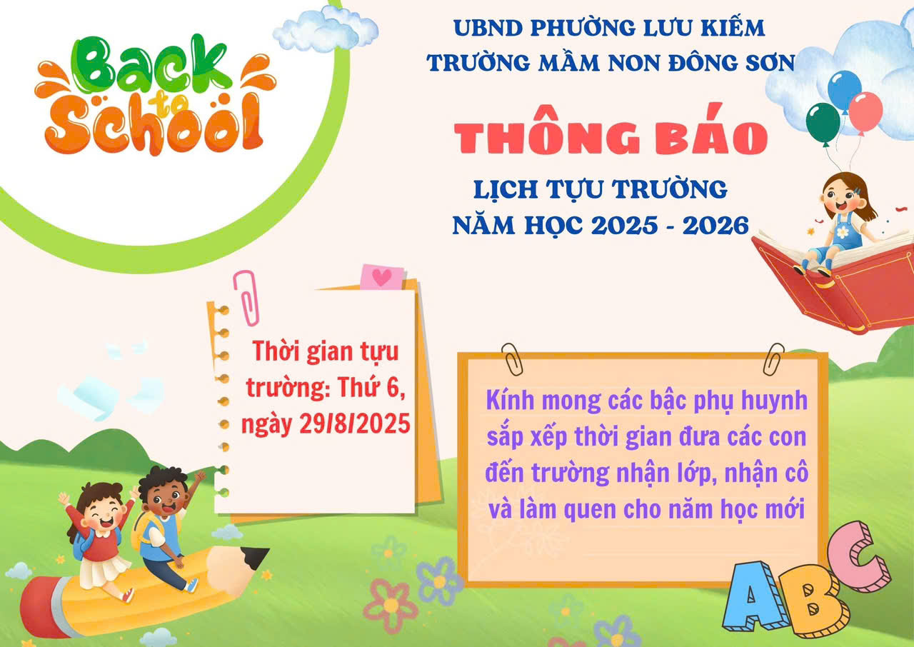 🖇️ Trường Mầm non Đông Sơn hân hoan chào đón các bé quay trở lại trường học sau kỳ nghỉ hè. Nhà trường trân trọng thông báo tới toàn thể quý bậc phụ huynh về lịch tựu trường và lịch học của trẻ như sau: